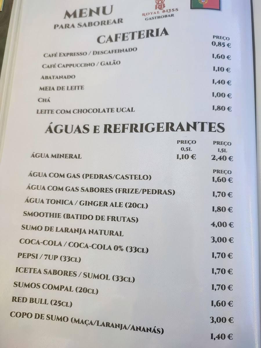 - Refrigerantes: Refresh yourself with delightful beverages like Sumol or CocaCola, each priced around €2.10.